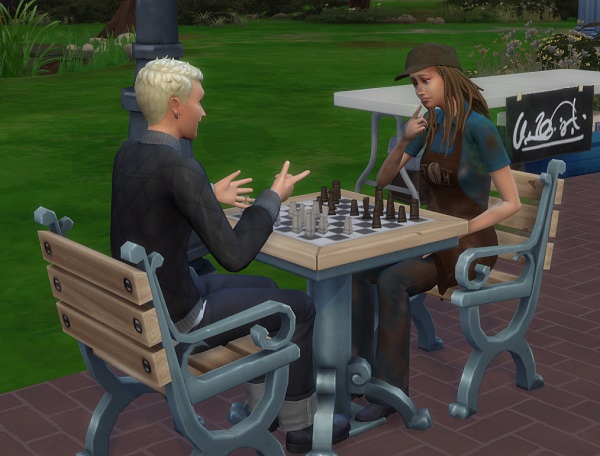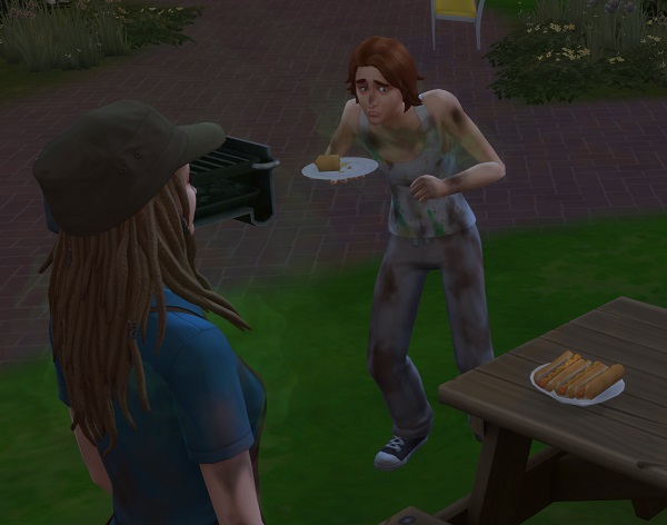 Back to the couch – bench – whatever it was. Another uncomfortable night and an early morning of work makes for a grumpy Sim.