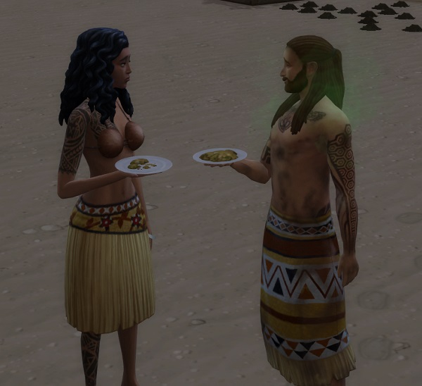 Once they were both exhausted, Nork dug up a pit for cooking in, and Utel prepared a feast of island vegetables to celebrate their acceptance to the village. It took a while to cook.. but by the time it was done, even Nork couldn’t resist the smells coming from the cooking pit.