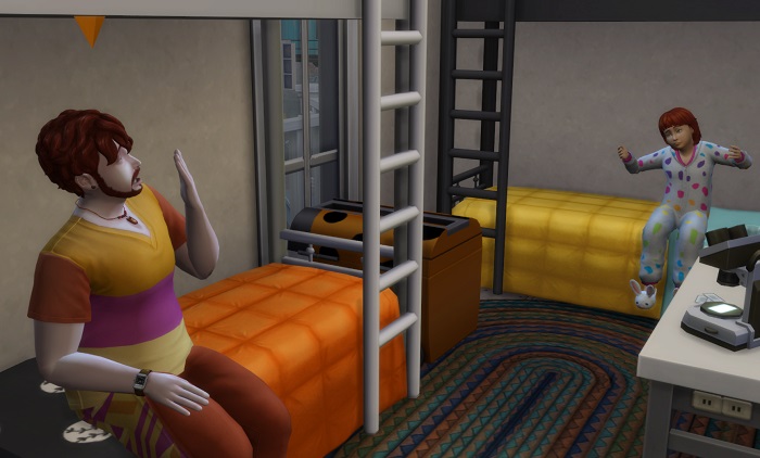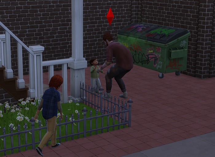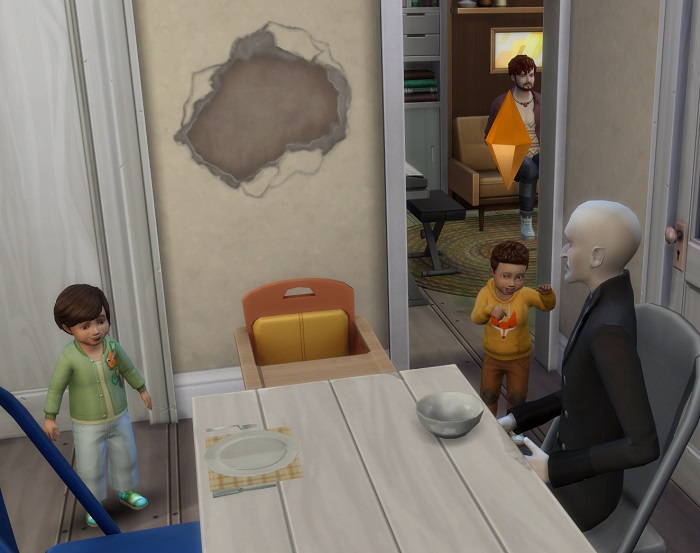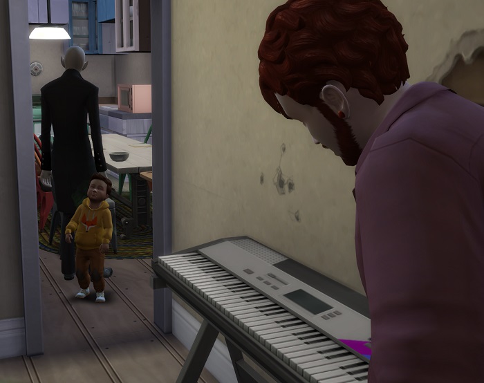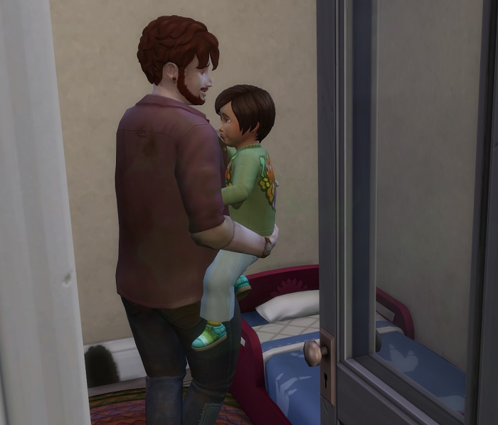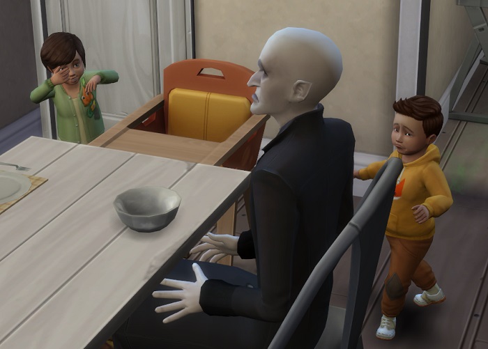 The vampire ended up growing and hissing at them unintelligibly, and Braydon hid his face, while Brett decided to give his dad a try again. Surely someone would want to play with him… or give him a much-needed diaper change or bath.