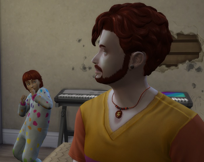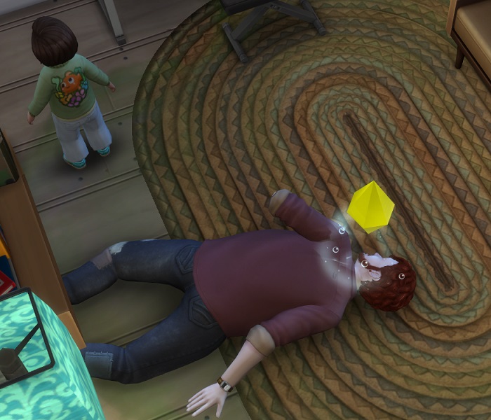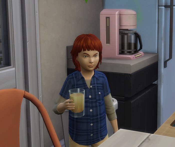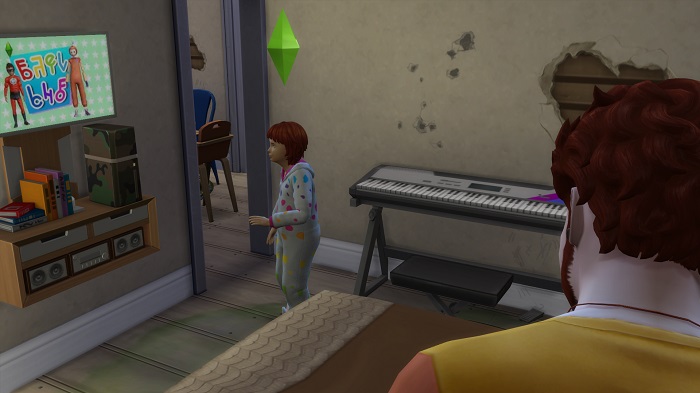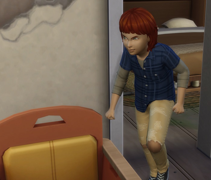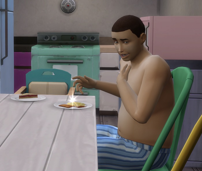 The night was quiet (except for the thunder outside) until Benji sat bolt upright in bed from a nightmare. He had dreamed he was a successful young man who did his taxes, lived in a boring apartment in the city, and never partied. (I’m serious, that’s pretty much what the game said he dreamed about – never seen that before…) Terrified it might come true, Benji vowed right then and there not to do his homework for the rest of the school year. And also: not to go back to bed any more tonight. So he got up, almost stepping on a mouse.. and got some congealed eggs and bacon from the fridge. (Yum?) He was afraid to wake up Bennie and Marnie by using the microwave to warm it up, however.. so cold rubbery eggs and bacon were what he ate. Hopefully, he thought, he could find enough to do to keep him busy until time to go to school in the morning. Heck, he was even willing to field the parenting duties for the twins should they wake up, too. Anything but going back to sleep.
