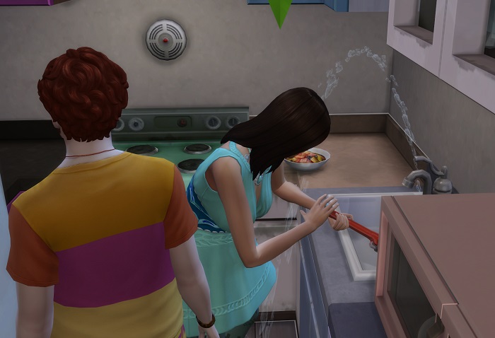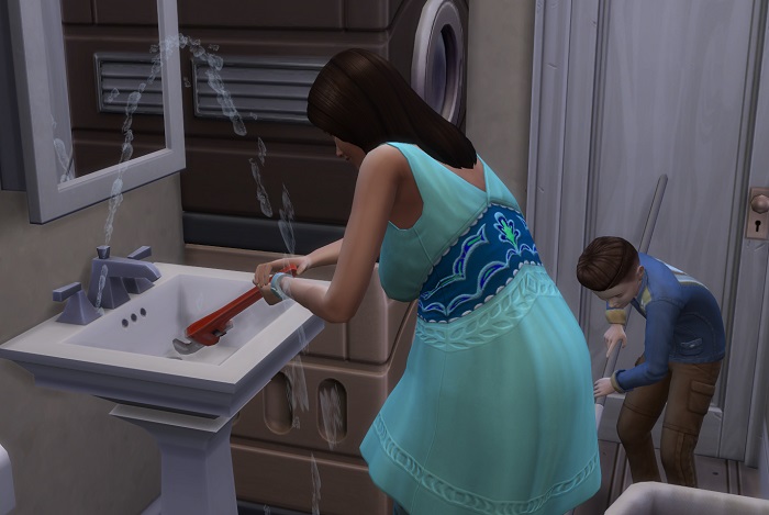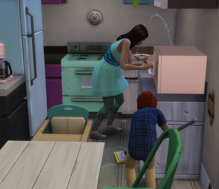 Marnie was far from done, however, because both the toilet and bathroom sink were broken, too…. so she headed into the most trafficked room in the house to fix them. Phoenix was on mop duty now, however, so Jaz was free to drink her juice in peace.