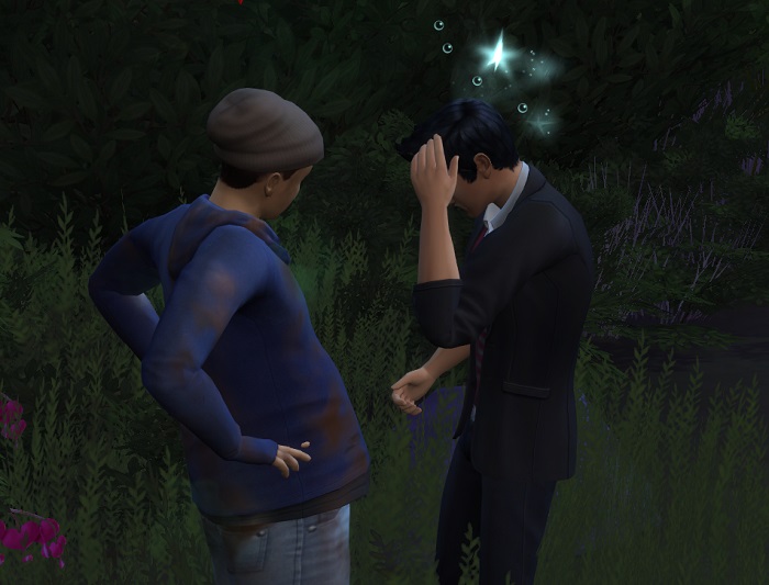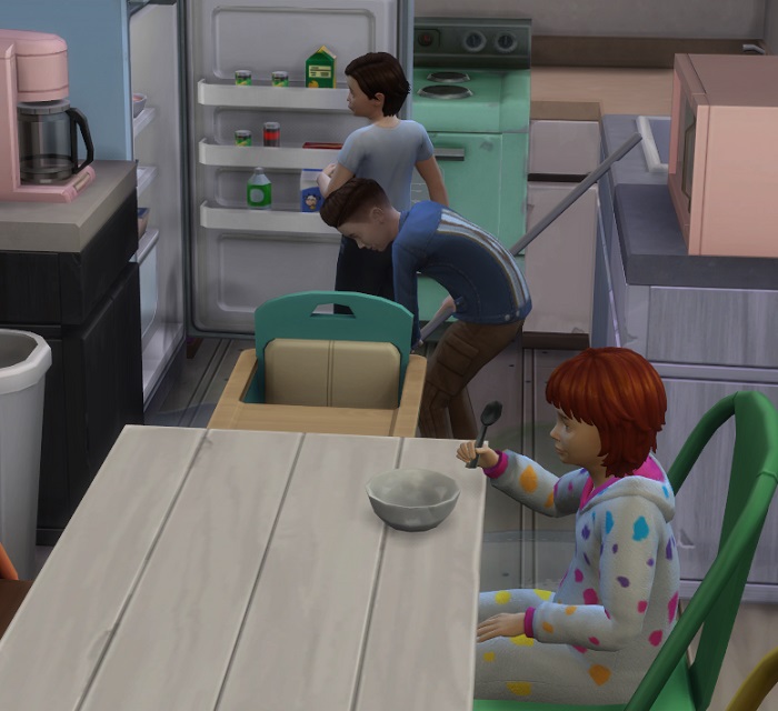 Morning comes, as it always does… and Phoenix is up first. He goes to find something in the fridge, only to find some empty leftovers plates and .. nothing else. Luckily, he finds cereal in the cupboard.. and decides maybe water will work? (Also: the fridge is broken. Again. Poor Marnie.)