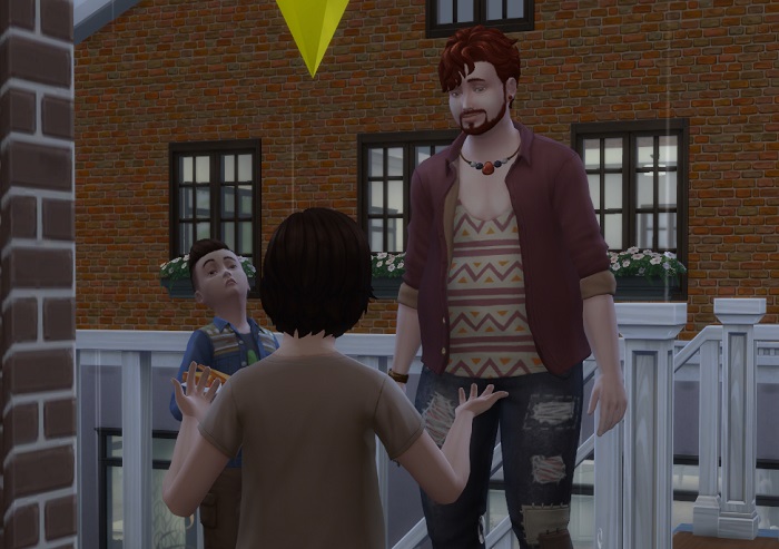 Outside, Myles and Phoenix are trying to socialize with their Dad.. but ending up getting grumpy one-word responses – he’s upset about standing in the rain.