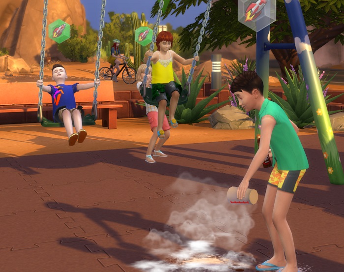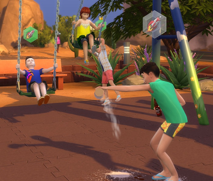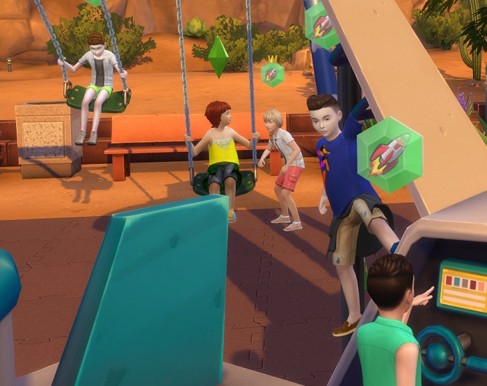Elsa agrees to push Jaz on the swings, while Phoenix swings by himself and Max (another club member) makes a mess.