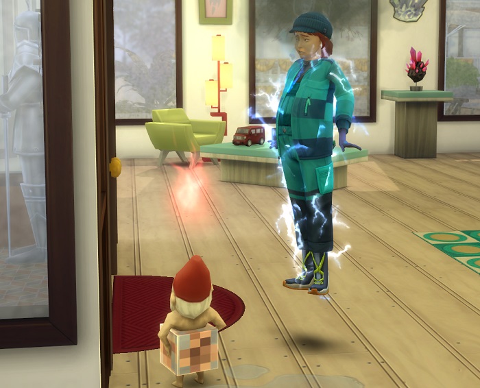 Bennie, curious about the lightning strikes downstairs, came down and decided to try his hand at a real apology. (The one he wasn’t about to give his wife…) The naked gnome was more than willing to forgive the children their sins, it seems.. and the halo appeared. Jaz cleaned up the mess from the previous failed apologies without being asked, but, as usual, nobody even noticed.