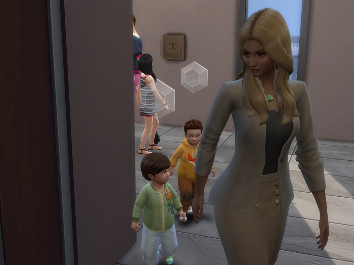 Kayla answered the phone on the way back to Newcrest, and had to change her plans in a hurry. The twins would have to be dropped off next because of a prior engagement that their foster parents had forgotten about. She collected the toddlers, strapped them into their car seats, and drove them all the way to San Myshuno.