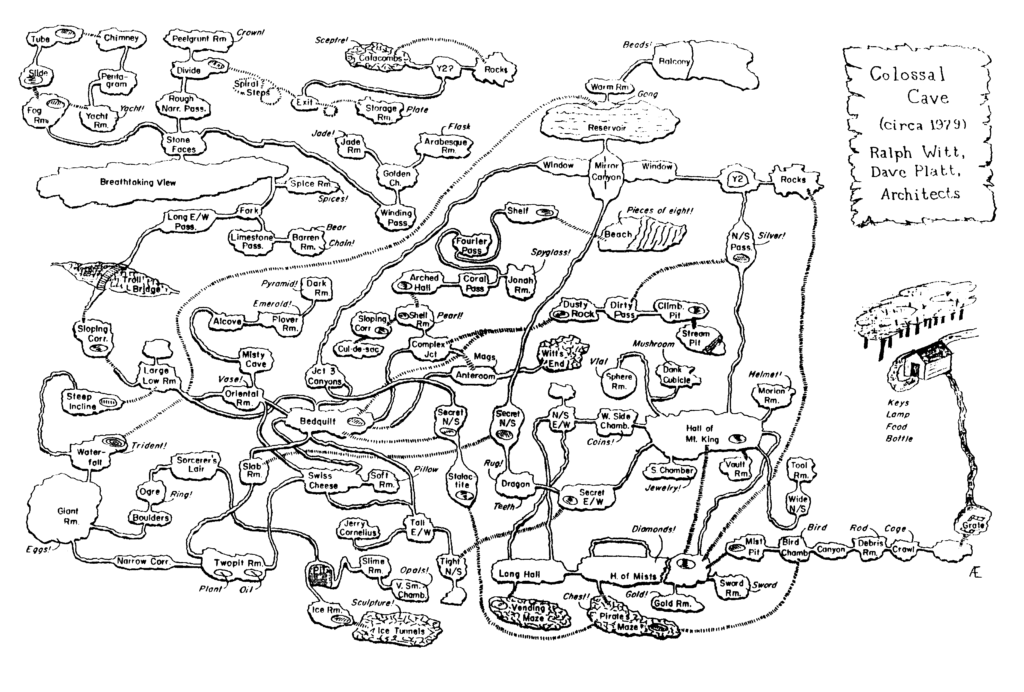 Apparently, the game’s actual name is “Colossal Cave Adventure” and it was (or is) a text-based adventure game released in 1976 by Will Crowther for the PDP-10 Mainframe Computer. In 1977, it was expanded on by Don Woods. In the game, you explore a cave system rumored to be filled with treasure and gold. It was based on Crowther’s maps and experiences while caving in Mammoth Cave in Kentucky, the longest cave system in the world, and it was intended to be accessible to non-technical players like his two daughters. He added some fantasy elements, and these versions spread around the “ARPANET” (the pre-internet) for use on teleprinters connected to mainframe computers. By the time I played it, it was on the black computer screen in bright green words, and was my first real glimpse into what a healthy dose of imagination can do when combined with a video game.