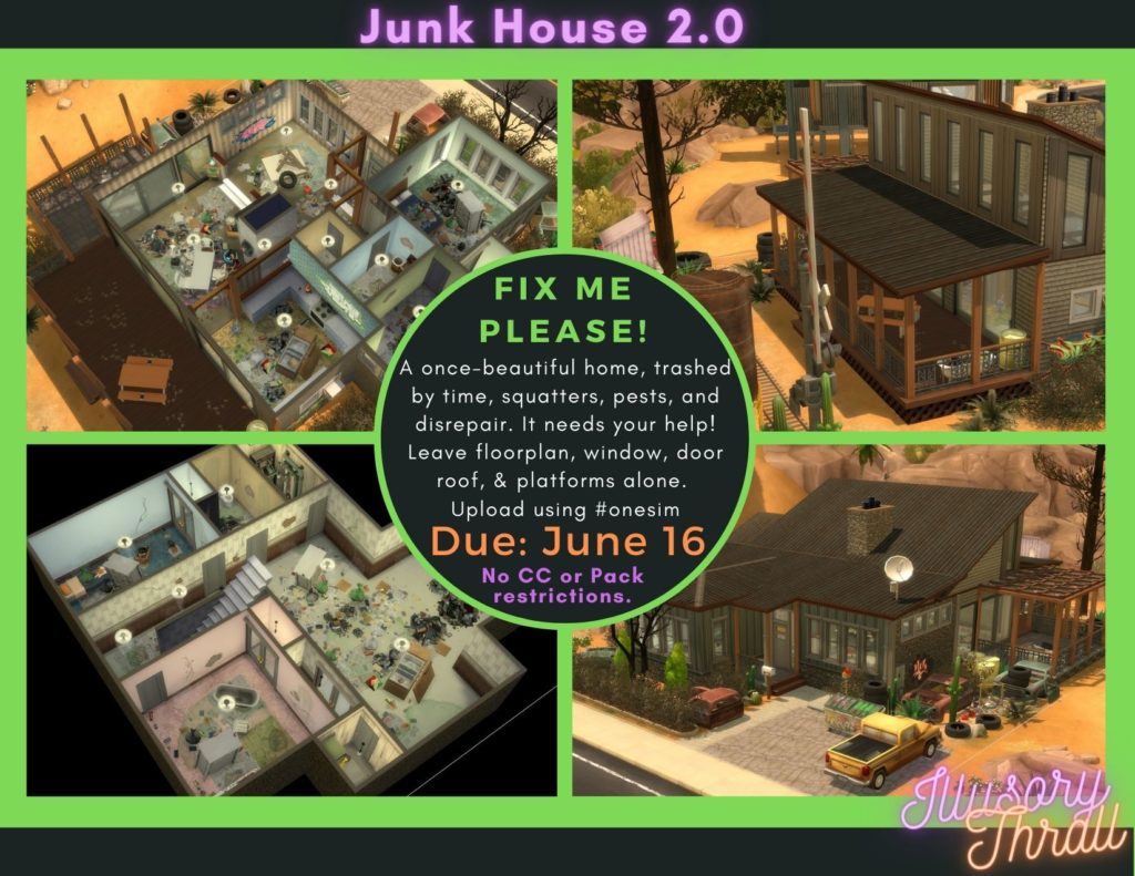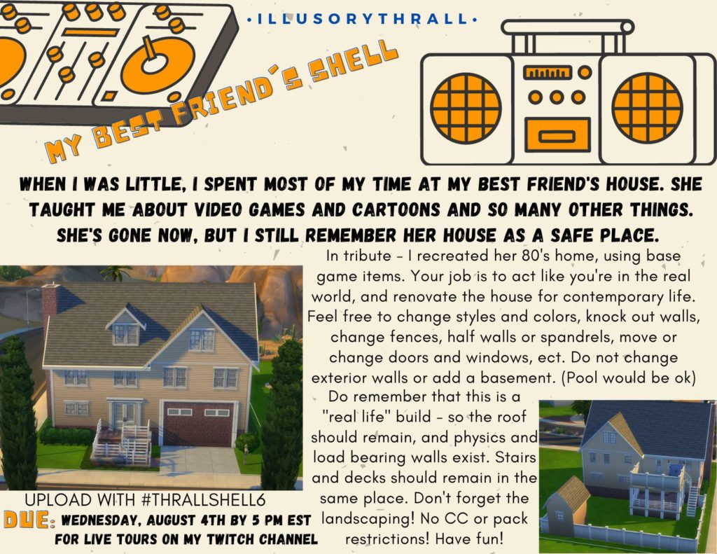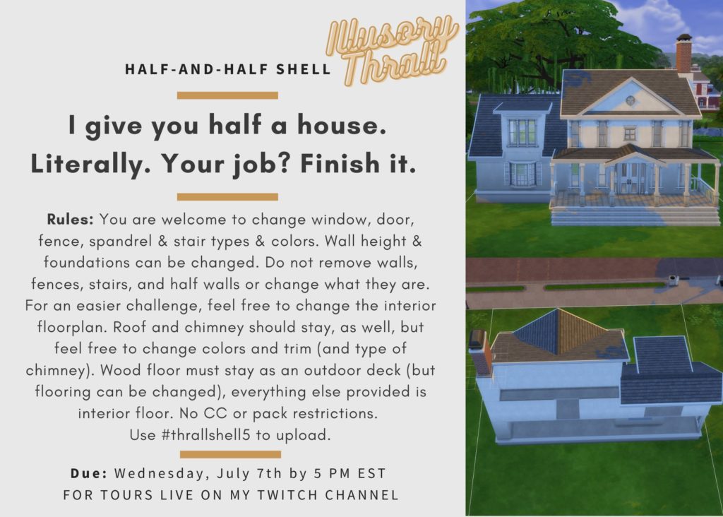 Rules: Foundations and terrain work ok, adding platforms or changing height ok, removing them not ok. Add roofing, windows, porches and a floorplan. Leave outside walls alone, but adding fences or halfwalls ok. Adding additional buildings NOT connected to shell ok, and don’t forget the basement! Feel free to use a different lot. NO CC or pack restrictions. Due before tours Saturday February 27th at 4PM EST on my twitch channel (IllusoryThrall) Post your builds with the tag #thrallshell2