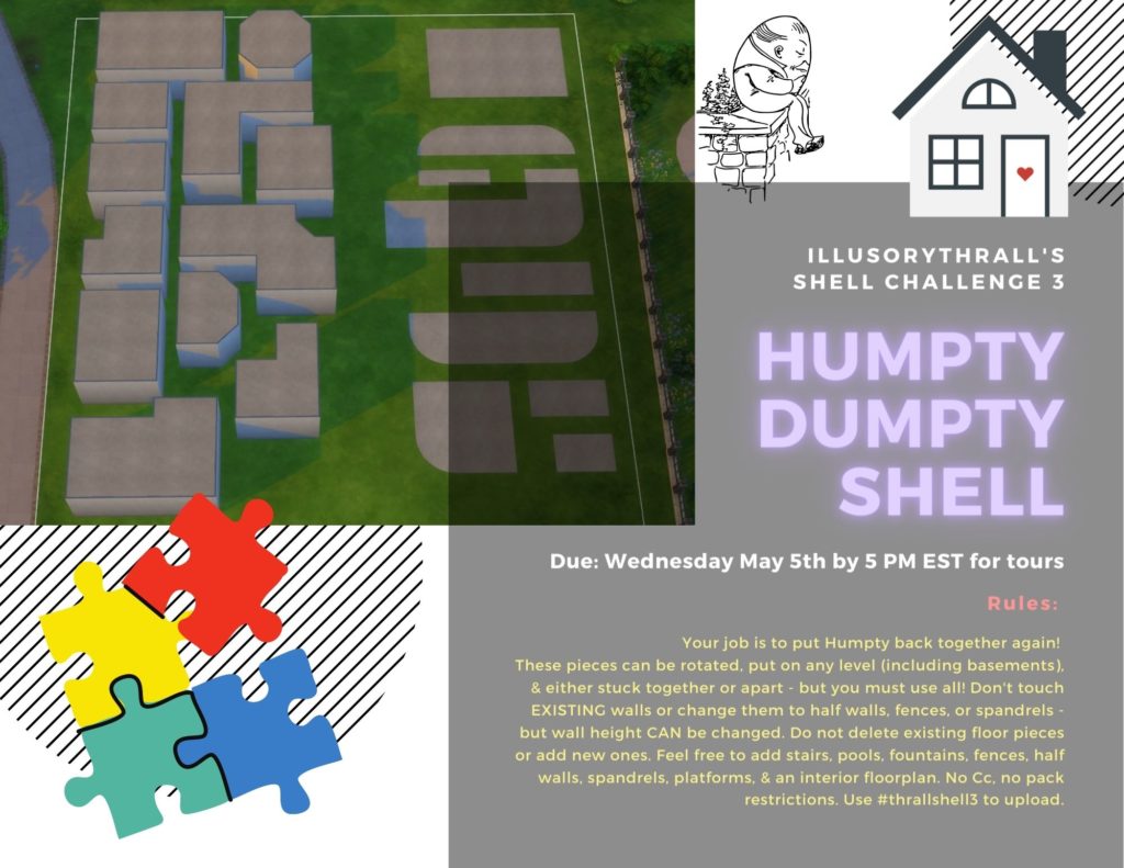 Rules: Your job is to put Humpty back together again! These pieces can be rotated, put on any level (including basements), & either stuck together or apart – but you must use all! Don’t touch EXISTING walls or change them to half walls, fences, or spandrels – but wall height CAN be changed. Do not delete existing floor pieces or add new ones. Feel free to add stairs, pools, fountains, fences, half walls, spandrels, platforms, & an interior floorplan. No Cc, no pack restrictions. #thrallshell3