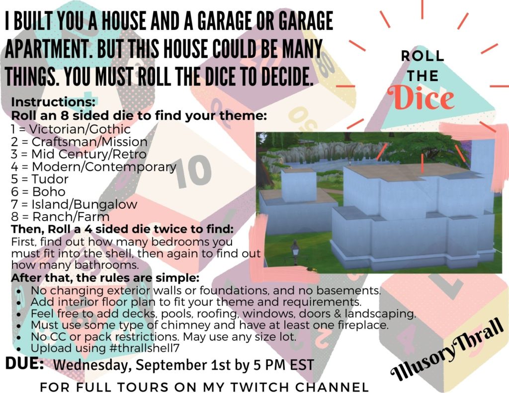 See the comments for your dice rolling directions! The rest of the rules: No changing exterior walls or foundations, and no basements. Add interior floorplans to fit your theme and requirements. Feel free to add decks, pools, roofing, windows, doors & and landscaping. Must use some type of chimney and have at least one fireplace. No CC or pack restrictions. May use any lot size. Upload using #thrallshell7 Due by Wednesday, September 1st for full tours on my twitch channel.