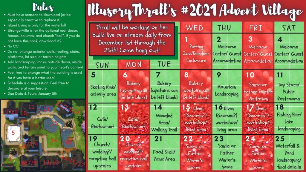 Check my twitter for full rules: twitter.com/illusorythrall/ #2021AdventVillage This version is with all packs used – Island Living for the waterfall, Strangerville for roof details, and seasons for the main lot. Cottage living for the llama. Due Jan 5th for full tours!