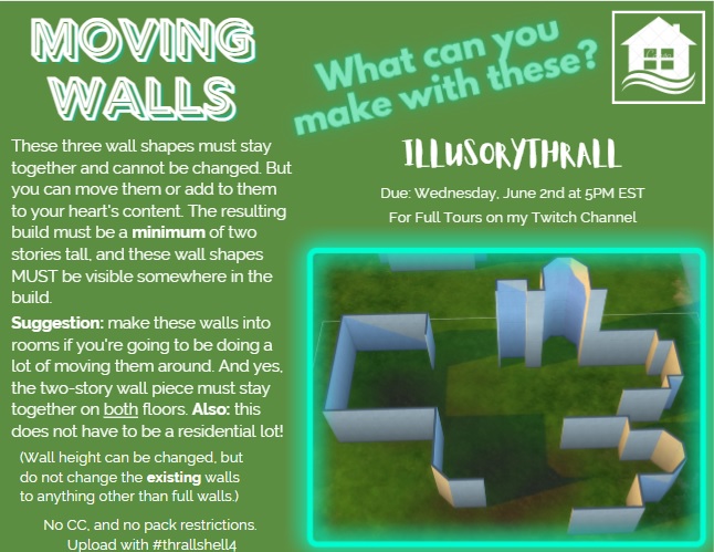 These 3 wall shapes must stay together and cannot be changed. But you can move them or add to them to your heart’s content. The resulting build must be a minimum of 2 stories, and the wall shapes MUST be visible somewhere in the build. Suggestion: make these walls into rooms if you’re going to be doing a lot of moving them around. And yes, the 2-story wall piece must stay together on BOTH floors. Also: this does not have to be a residential lot! #thrallshell4