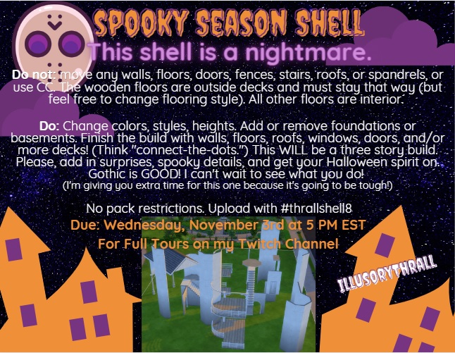 Rules: Foundations and terrain work ok, adding platforms ok, removing them not ok. Add roofing, windows, and an interior floorplan. Leave outside walls alone, but adding fences or halfwalls ok. Adding additional buildings NOT connected to shell ok, and basements are allowed. Feel free to use a different lot. NO CC or pack restrictions. Due before tours Sunday January 31st at 4PM EST on my twitch channel (IllusoryThrall) Reposted on gallery to add: Post your builds with the tag #thrallshell1