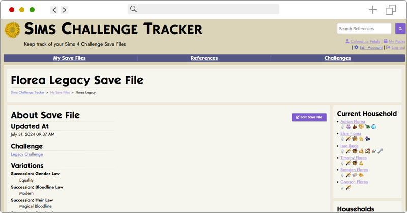 After some discussion and negotiation, I now have a partner in Crime for my Sims Challenges. Not a co-author… although there will be more collab challenges coming up in the future… but a programmer who has a WONDERFUL tracking website she designed for tracking her challenges. It’s SO cool. It’s free, and you can sign in, add your saves that you want to track, as well as track all the goals, see the rules, and even add and save pictures and information about your sims’ stories. I cannot speak more highly about this tool, and the programmer who has spent the last 8-9 months of their life getting it working from the ground up. When I first saw it, I knew right away it was something that I wanted to be a part of. Either I needed to take the time to learn how to program one of my own, or I needed to find a way to get my challenges up on this site.