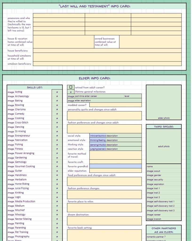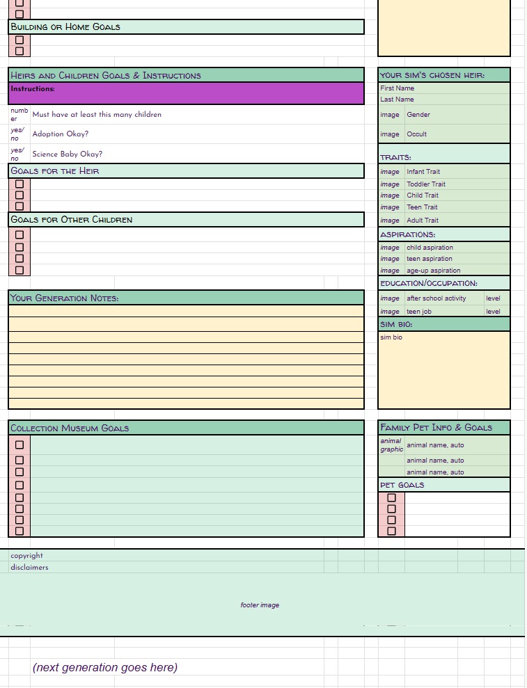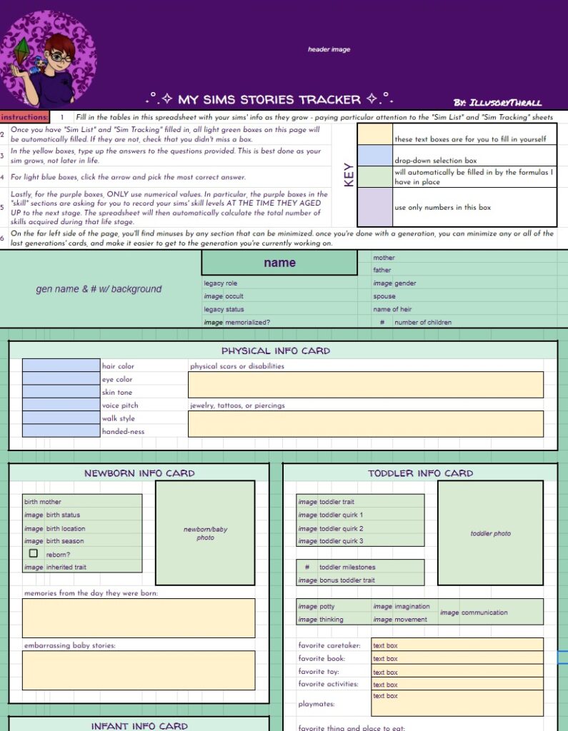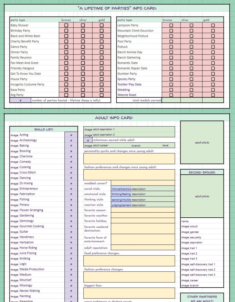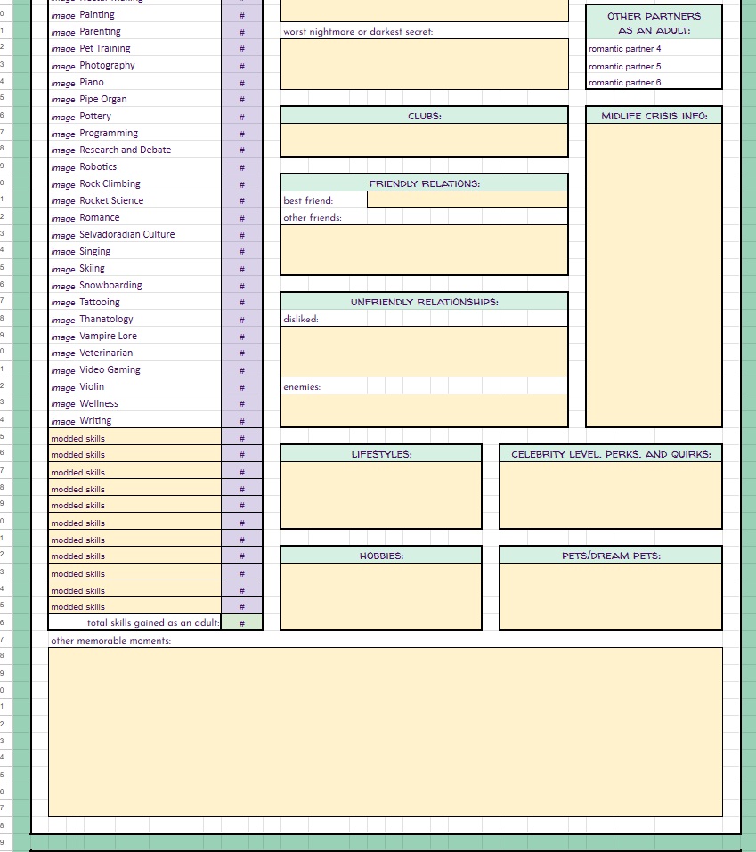 BUT… THAT’S NOT ALL!! On top of the free spreadsheets I showed the starting templates for above… I will also be offering for a small fee (probably through patreon, maybe etsy as well) spreadsheets with even MORE info for you to track your sims with. These will be basically the same as the free version with the notable exception – they will have a linked, working, fully functional Sims Story page. It’s detailed, it’s gorgeous, it’s amazing, I cannot say enough about it. And not only is it amazing in it’s full form, EACH SECTION will be able to be minimized so you can reduce scrolling if you’re on later generations. I will be making a “Storyteller’s Dream” tracking version for ALL of my challenges, as well as for Super Sim, and a plain old 10 generation legacy. If enough people are interested, I may even make a sheet for longer legacies. Now, before you complain that it’s going to be paid… I’ve put so many hours of work into this, it’s not funny… and also, there will always be the free, fully functional version without the massive story tracking page(s).