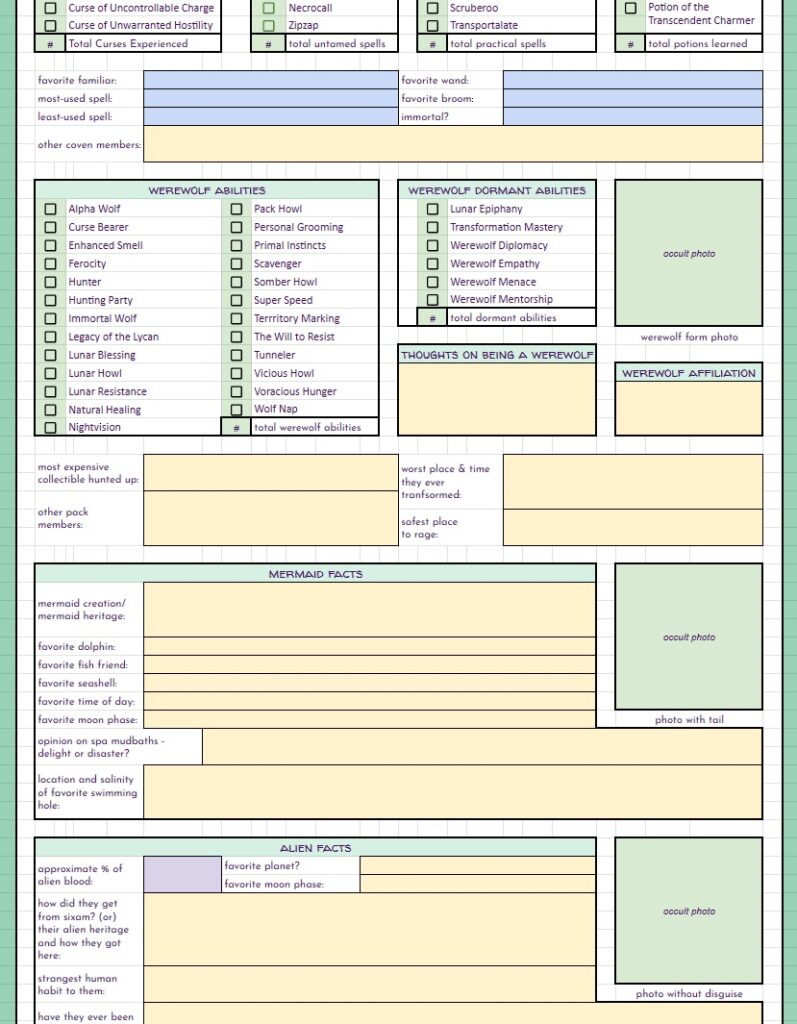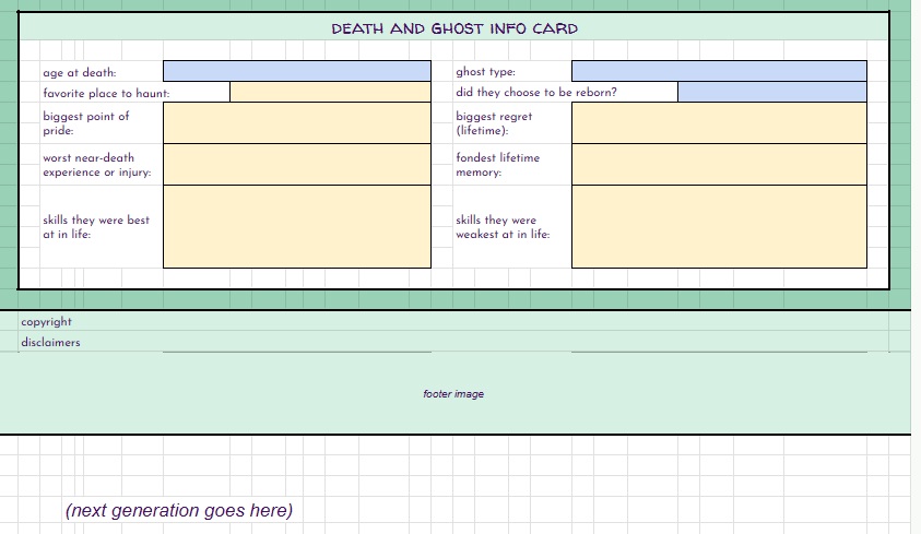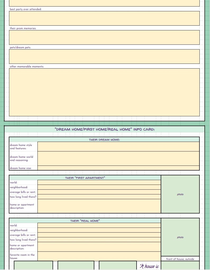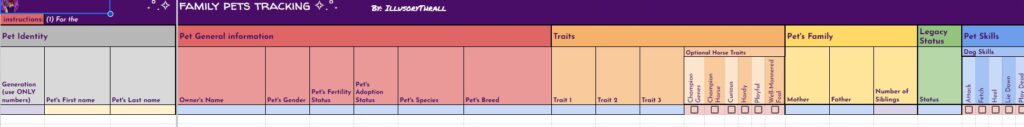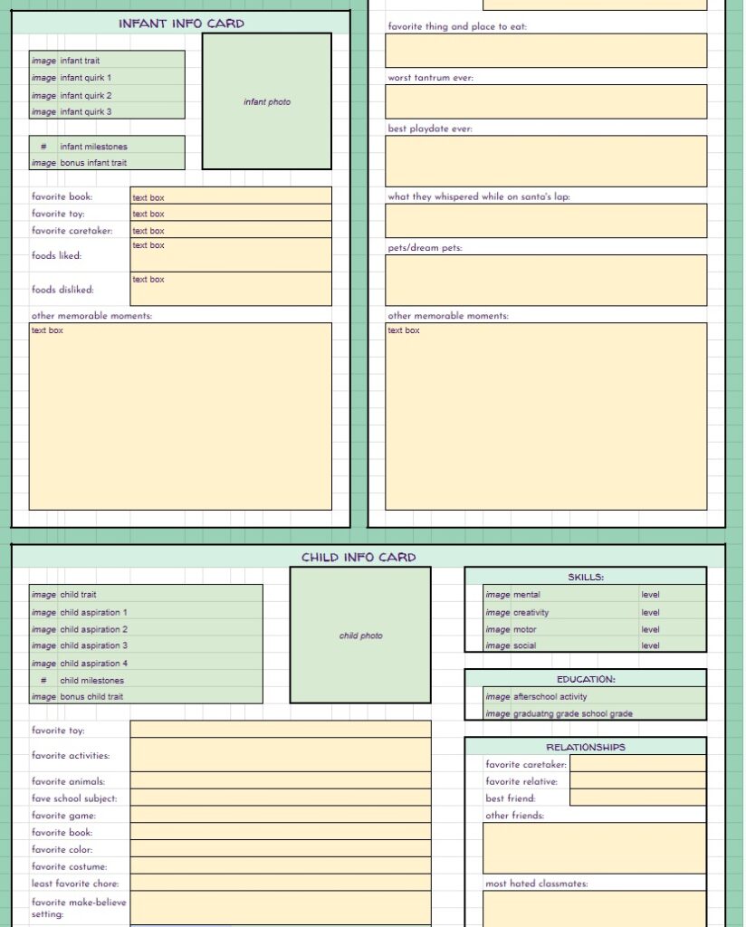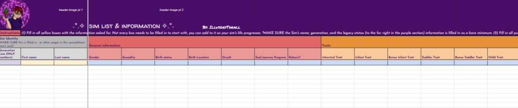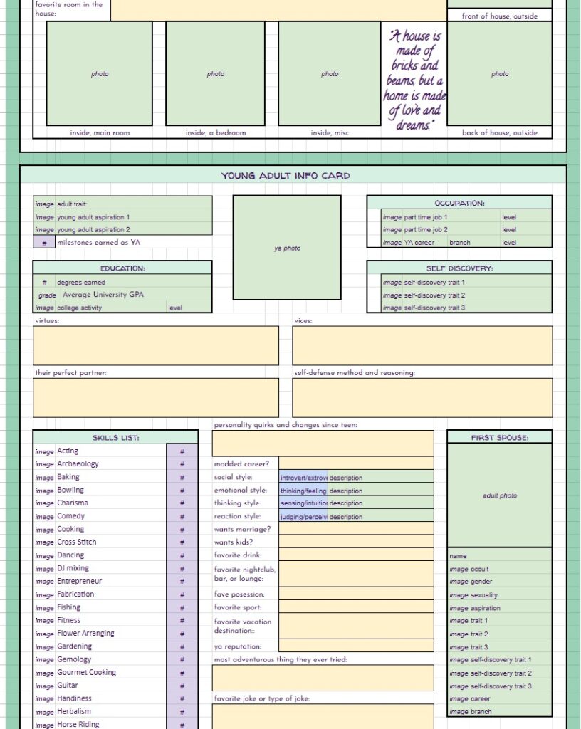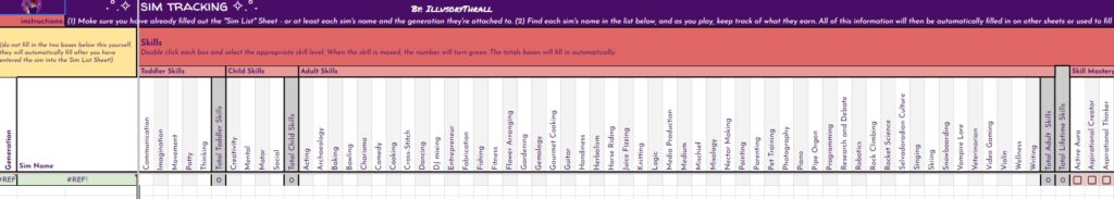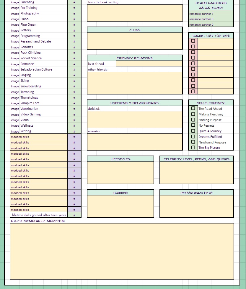 BUT… THAT’S NOT ALL!! On top of the free spreadsheets I showed the starting templates for above… I will also be offering for a small fee (probably through patreon, maybe etsy as well) spreadsheets with even MORE info for you to track your sims with. These will be basically the same as the free version with the notable exception – they will have a linked, working, fully functional Sims Story page. It’s detailed, it’s gorgeous, it’s amazing, I cannot say enough about it. And not only is it amazing in it’s full form, EACH SECTION will be able to be minimized so you can reduce scrolling if you’re on later generations. I will be making a “Storyteller’s Dream” tracking version for ALL of my challenges, as well as for Super Sim, and a plain old 10 generation legacy. If enough people are interested, I may even make a sheet for longer legacies. Now, before you complain that it’s going to be paid… I’ve put so many hours of work into this, it’s not funny… and also, there will always be the free, fully functional version without the massive story tracking page(s).