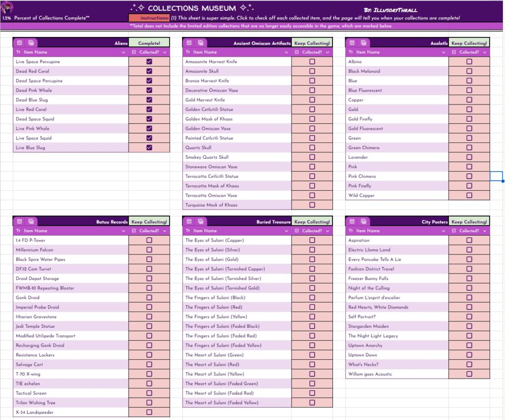 Anyway. The plan is, all of my challenges will REMAIN FREE, and will have a free spreadsheet tracker available for you to copy and use at your discretion. (Pics below) – Missing from the pics is a “tracking and Trivia” page, which I still have to make.